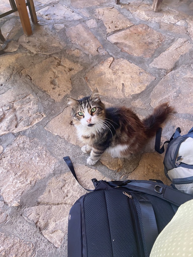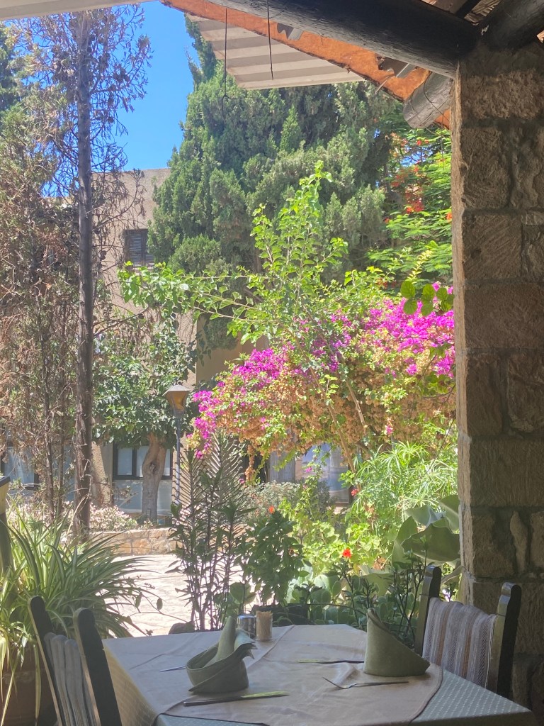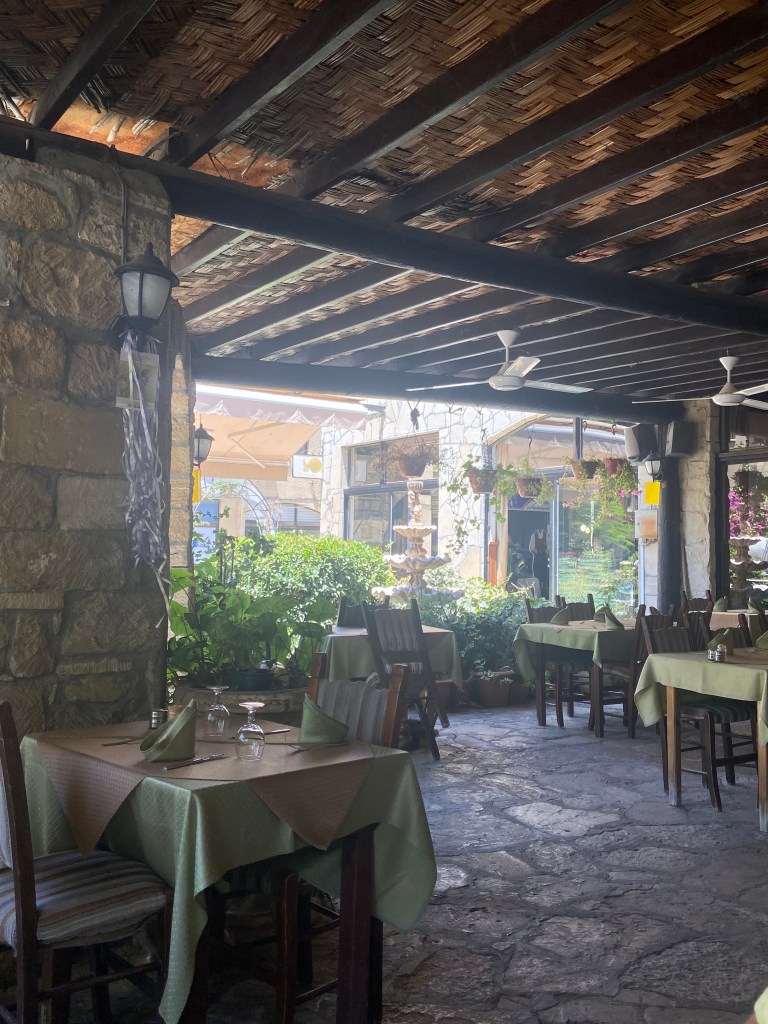 During our visit to Paphos, we (Micheal) decided to eat at a restaurant called ‘Mother’s’. After waking up early and walking around in the heat, most of the students, myself included, were considerably hangry. We were initially going to eat lunch at a place along the boardwalk, but Micheal told us he found a good place to eat on Google Maps. We all agreed to this mystery place and began our long six minute hike. Most, if not all, of us doubted Micheal in our heightened state of hangriness. We trudged behind him, ready to be disappointed. However, we were not disappointed in the slightest. We came up to a beautiful outdoor dining space lush with flowers and leafy plants, tucked on a street away from tourists. Making our way up, we were greeted by two well-fed and cared for cats. We were the only ones in there when the owner came out to welcome us in. He was super sweet and brought out amazing bread and garlic butter for us. I ordered the lamb special, which was actually my first time trying lamb. It was tender, and immediately fell off the bone. The silence after our food was brought out was a unanimous testament to the impeccable taste of everyone’s dishes. Once we had finished, he brought us a bill and a round of homemade, orange-flavored shots on the house because he said we were lovely. This was the best restaurant I’ve ever been to, and I would genuinely come back to Cyprus just to eat there again.