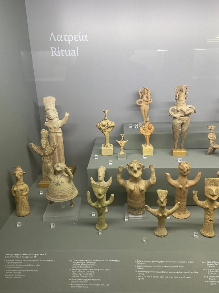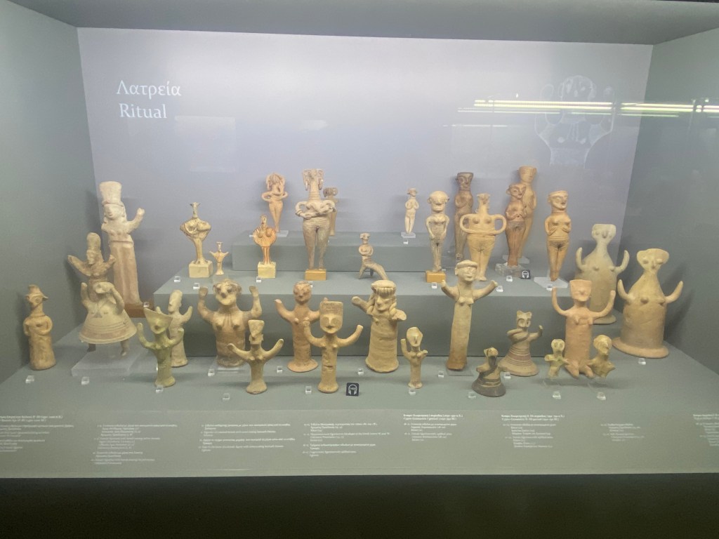 The Museum of Cyprus, located in Nicosia, houses a collection of ritualistic figurines. The figurines are shown below date back to the Late Bronze Age (1650-105 BC). The figurines are categorized into two main groups based on their characteristics. The first group of figurines has a bird-like appearance in addition to round eyes. They are usually adorned with circular earrings, and carry a baby in their left arm. These first groups of figurines are assumed to have Syrian prototypes. The next group of figurines have more naturalistic features and are more expressive. Rather than carrying an infant like the first group, this group is often depicted with their arms below their breast. Both groups are assumed to be representative of a fertility goddess. The goddess they’re associated with is Astarte, the great goddess of the east. Astarte herself is commonly associated with the ‘Great Goddess’ of Cyprus. Beginning in the Cyprus-Geometric period (11th Century BC), the third type of figurine emerges. Once again, this figurine is associated with the worship of a fertility goddess; specifically, the worship of Aphrodite-Astarte. Unlike the other two types of figures, however, it’s not entirely clear whether this third type is representative of the goddess herself, or of priestesses associated with the goddess. Regardless, all three types of figurines share a common association with the goddess Astarte, though in varying forms. The different variations of the same goddess likely point to altering religion as cultural influences change over time.