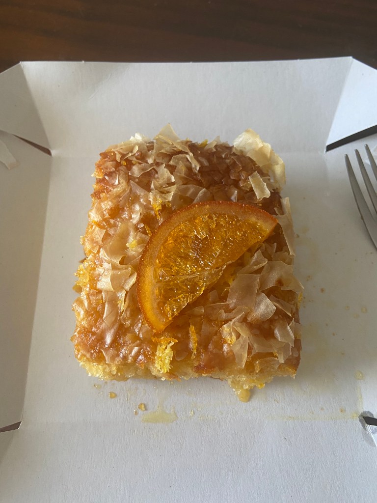 One of the highlights of my trip has been a 24-hr bakery called Zorbas. Anytime I go in there by myself, one of the ladies working there laughs at me because I go there so much. Because of its location, it’s a convenient stop after going to buy groceries at the mini market. My favorite thing to get there is Πορτοκαλόπιτα, or, ‘orange pie’. This old-fashioned Greek cake is made with Greek yogurt, and phyllo pastry, and is soaked in syrup after it’s made. The syrup is prepared before the cake and consists of sugar, honey, fresh-squeezed orange juice, and cinnamon stick. Once baked, the cake is soaked in this syrup, and, to me, the texture becomes similar to that of a tres leches cake. This cake is a popular option for treating house guests. It also makes a great pairing with Greek coffee because of its orange flavor. Whenever I go to the bakery, I always pick up this cake. Just the other day, I finally was able to get two other students to try it. The amazement on their faces immediately after the first bite made me feel proud that I introduced them to the wonders of Πορτοκαλόπιτα. It almost makes up for no one knowing what Spring Fling cake is. I usually don’t eat cake often, but I could easily eat this cake every day, even multiple times a day.