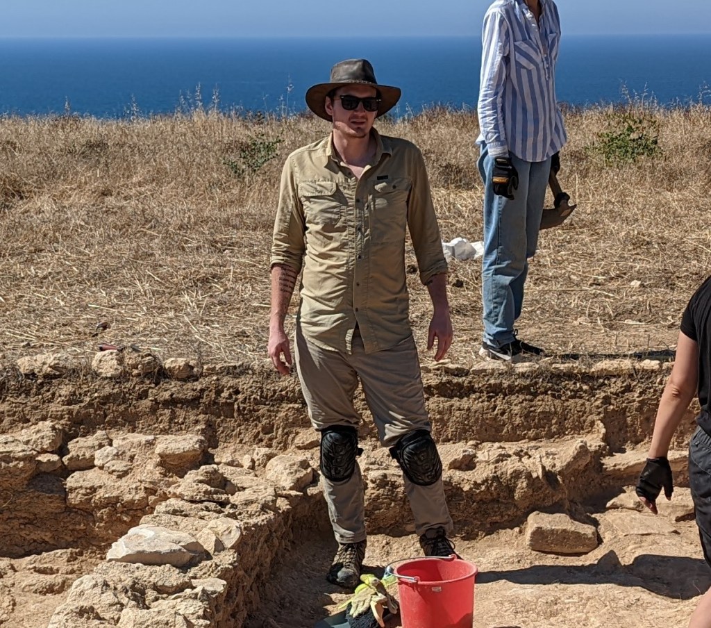 The early parts did not yield many finds. Eventually it was realized that I blew past the floor of the room that used to stand there, but we had a section of it still present. This helped us determine the location of the floor as I worked my way into the more narrow parts of the SU. And this is where things started getting interesting. After some removing of floating stones in the broken mud brick layers, approaching the assumed floor level, I had an obvious collection of broken pottery rather conspicuously stacked on top of each other. As I worked the sherds of pottery out, nothing stood out about them other than the fact most of them seemed to fit together or be nearly identical. Something I initially took as a stone, as I do not have my archaeologist eye developed yet, I worked around and ignored. After taking a moment to get a drink of water and catch some of the coastal breeze, I stared down at the collection of material and realized there was a pattern on the stone. I got back in the trench and brushed away at it for a short way before a smile took over my face.