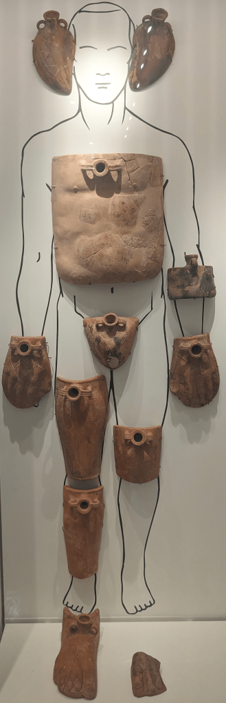 The vessels which were constructed to be very thin (only about 3 mm) would have been filled with either hot water or oil and then applied to the body part in need of healing. Paphos during the Roman period was a well-known and vibrant medical center, so I think it is very cool to find possible evidence of what may have been a rather lush medical treatment at this time. Similar vessels have also been found in areas of metropolitan Greece, and heat patches made of cloth are mentioned in ancient texts for the use of treating rheumatism. I think they must have also had some form of spiritual healing aspect due to being in the shape of the body part they were intended to heal and show evidence of the strong association between belief and medicine. These were really cool to see in person and added a truly unique aspect to the museum!