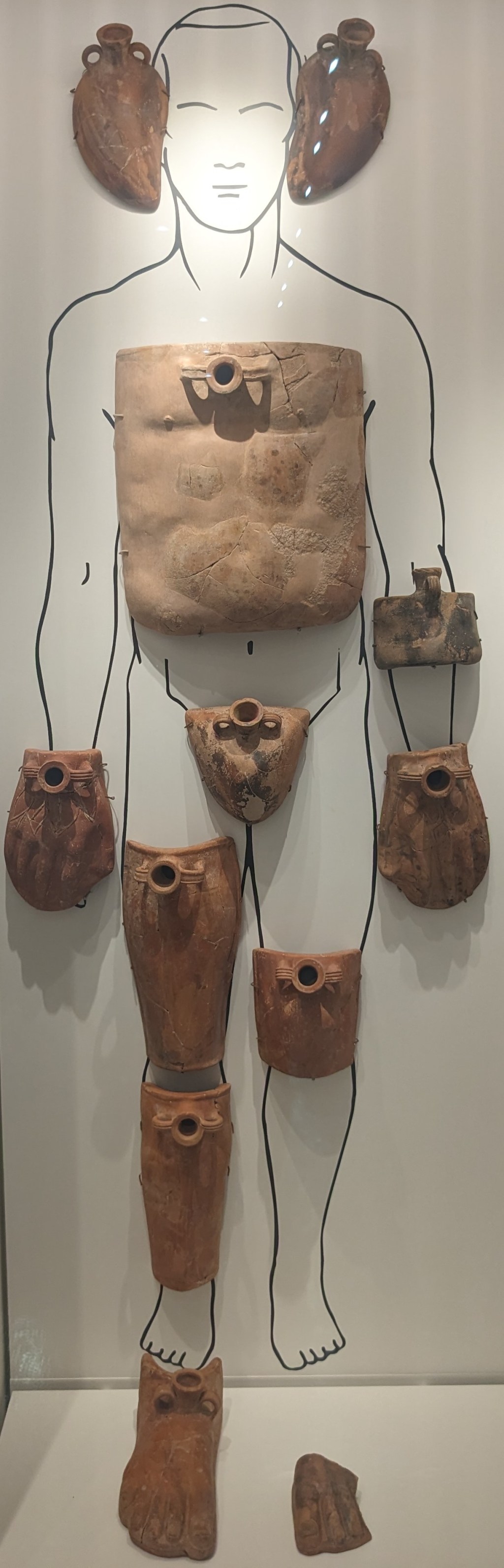 Hi all! We recently took a trip to the lovely city of Paphos. There we visited the Paphos Archaeological Museum, which was simple, small and truly wonderful! My favorite artifacts there were the clay hot water bottles, which were excavated from a building near the center of Nea Paphos. The building, though not completely excavated, is thought to have been a medical center due to medical tools being found in tombs, inscriptions relating to doctors, and the clay water bottles in the shape of specific human body parts. The clay vessels date to the early Roman period (roughly 1 c. BC – 1 c. AD) and are particularly unique finds. The vessels are in the shape of the body part they would have been used to heal, and include ears, the chest, elbows, hands, groin, thighs, knees, shins, and feet.