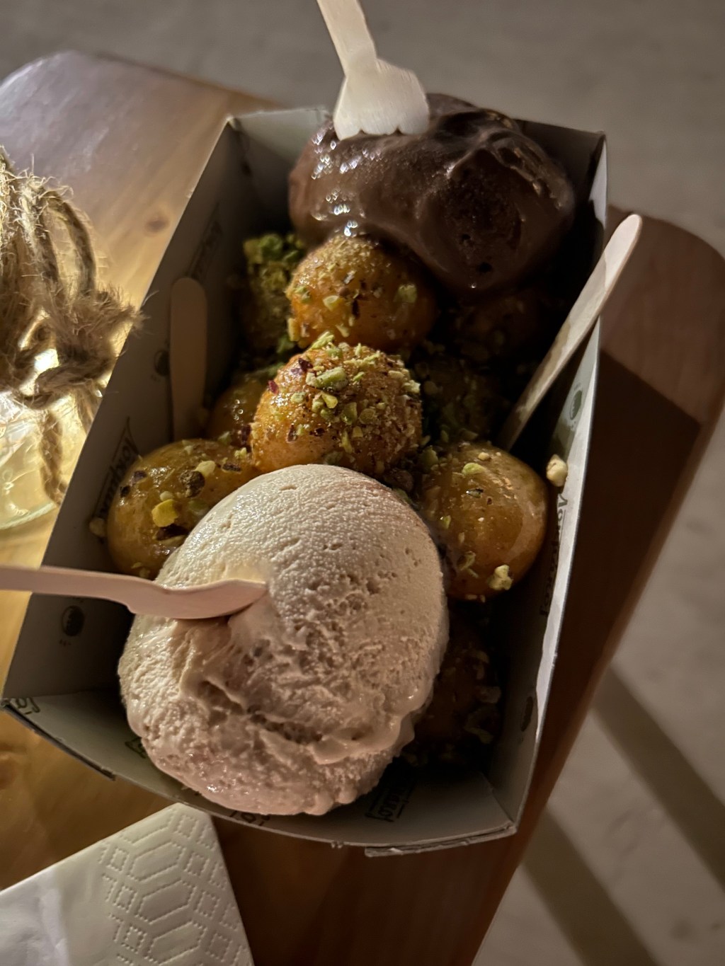 My first day on the island of Cyprus, I was stressed out and jetlagged. The fact that I was here on a tiny island in the Mediterranean had not hit yet. A group of us after dinner were wandering around Larnaca when we came across Lokmakos, which at first looked like a nice place to get gelato. As we perused the menu, we realized that it was not just gelato but handmade donut holes served with gelato. Behind the counter we could watch the staff fry these small dough balls as the desserts were made to order. I ordered the Cyprus classic, which was the donut holes or Lokma with a sugar coating, honey, and vanilla ice cream. We all waited patiently for our Lokma and when they were handed to us, we went through a back door of the shop which led to a beautiful courtyard. We sat on a stone structure in the middle of a stunning courtyard and tried our Lokmakos. They are the best dessert I have ever had. They are crunchy on the outside and doughy on the inside and the gelato pairs perfectly with the small donut holes. As I sat there eating my Lokma it finally hit me. After all the investigating, planning, and brutal travel, I had finally made it to Larnaca, Cyprus, an island that is full of a mix of so many peoples and traditions. I was sitting on stone eating a food that has been tied to 13th century Arabic cookbooks. Lokma is a dessert with a deep history. It is mentioned often in One Thousand and One Nights and was made by palace cooks during the reign of the Ottoman empire. It has traditionally been served as fried dough balls soaked in honey or syrup. Not only does it have origins in Arabic culture, but it also served and tied to Greek, Turkish, and of course Cypriot culture. Lokma are an important part of the food cultures for these countries. On a whim I was able to try these amazing donut holes that connect me to the culture of many people over thousands of years. I am so very glad I decided to stop at Lokmako as not only did it bring me to the reality of being on this island but they are absolutely delicious.