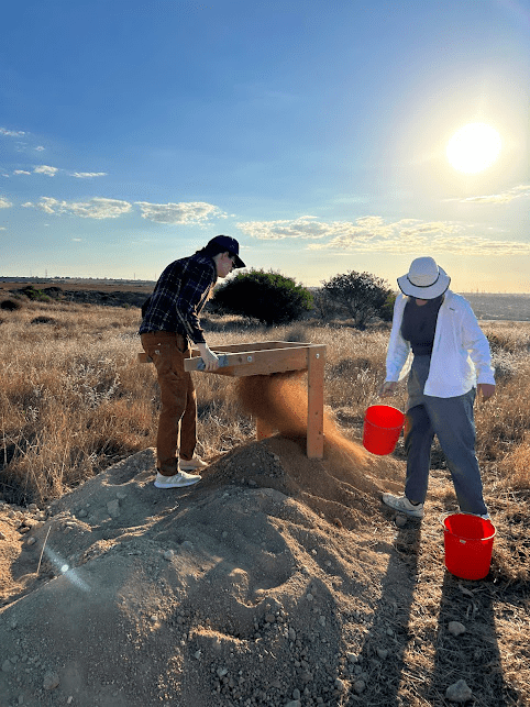 You’re not going to be very good at it the first few buckets of dirt you sieve– and you will have to sieve. Whether you love it, hate it, or just accept the necessity of sieving, you’re going to have to prop up the legs of the sieve and shake a whole lot of dirt. It’s generally a two-person job: one person is the shaker and the other is the pourer. The frame of the sieve is wooden, and while there’s probably some duct tape for your hands, if you’re shaking I recommend wearing gloves. You’re going to get weird blisters in bizarre places anyway (mysterious calluses from cleaning pottery with a toothbrush, for example), so a little extra protection never hurts. One or two buckets of dirt freshly scooped from the trench are going to go right onto the mesh stretched across the frame. And then you shake. You’re going to get dirt on your face and in your eyes, so my second recommendation is sunglasses and a bandana. Pull that bandana right up to where your sunglasses meet on your nose, and shake. You’re going to shake a lot.