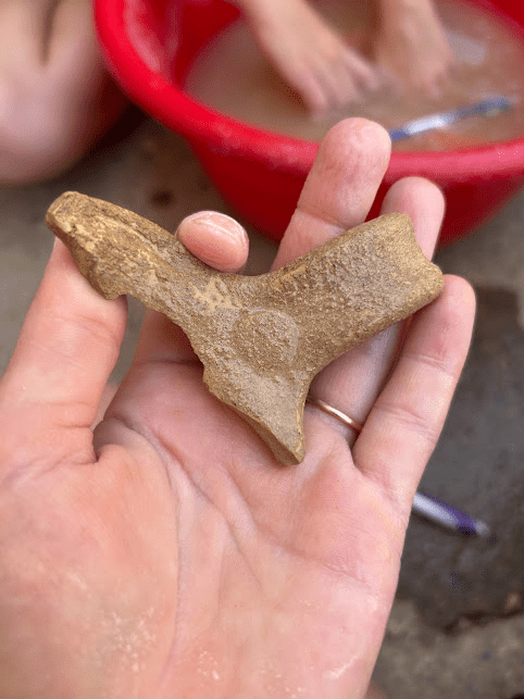 Pottery sherds, on the other hand, come in a few varieties. First, there’s diagnostic pottery. These sherds will be things like handles and rims, or, if you’re lucky, feet or bases. They’re called diagnostic because these pieces can be used to tell what kind of vessel you’re dealing with: a lamp, styles of cookwear, or great big amphora handles. Take a minute when you find an amphora handle to just enjoy holding it (nobody will mind if you pretend to be hefting up an amphora of oil or wine).