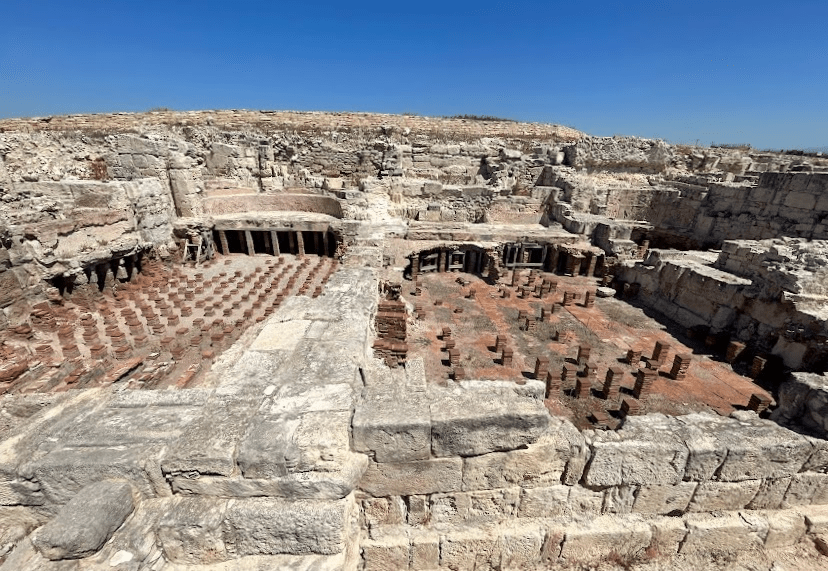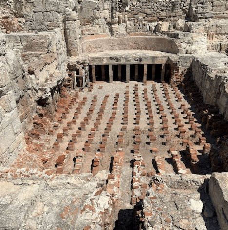 As we were touring the baths of Kourion, we passed a string of excavated underground rooms with short rows of what looked like stacked clay pillars.