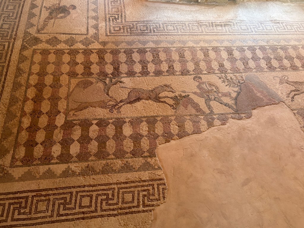 Paphos is known for its intricate and remarkably preserved mosaics, they are considered among the finest in the Mediterranean and form part of Kato Pafos, which we visited on our field trip to Paphos. The mosaics were discovered in 1962, when a farmer plowing his field came across one, totally unintentionally. From then on, systematic excavations were carried out, and led to the discovery of a group of large houses, the floors covered in mosaics, many of them incredibly intact. Archaeologists came to identify courtyards, dressing rooms, baths and other rooms and facilities of the houses. The houses were then named after the figures that adorned the floors, including the houses of Dionysos, Theseus, and Orpheus. The floor mosaics across all these houses depict various scenes from Cypriot life and Greek mythology. Some of the mosaics that stood out to me were the mosaics of the Bath of Achilles, the Four Seasons, and all the imagery of fruit and birds. The mosaic of the hunting scene also intrigued me, it felt more animated than the others. I think I found it interesting to see all the animals, running, not posed or sedentary.