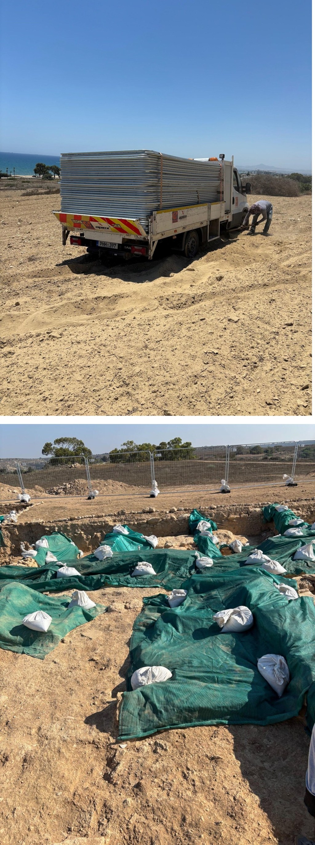 We did all of this so that the supervisors could take drone shots of the entire dig site. Once the trench I was working on was clean enough for pictures, I started filling dirt bags with Teddy. Teddy and I filled up about fifty bags on our own, and then did fifty more with others’ help. Then, on Friday, we arrived at the dig site around 6. We all took group photos and then started to close up the dig site for the season. We all got split up into different groups. Some people were instructed to lay a green tarp on the walls of the dig site to protect them until next season. Once the green tarp was laid out, we placed the dirt bags around it to ensure it wouldn’t blow away and to help stabilize the walls. The others started to build the fence. Two people would grab a piece of the fence, while others would grab black support blocks that the fence pieces would be inserted into. We then secured the fence with little bolts and weighed down the black support blocks with more sandbags. The entire process took a little bit more than an hour to do. Once that was done, we all said our farewells to the dig site and went back down the hill.