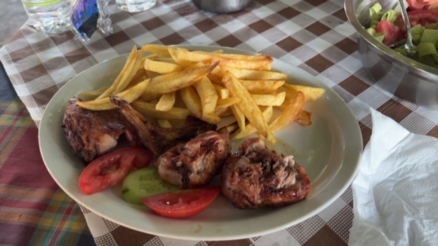 Two friends and I were walking around after doing some shopping, and we wanted to find something to eat, so I went on Google Maps to find something nearby. I found a place called “To Magkali,” a 3-minute walk away, but it only had a few photos of a garden and a couple of dishes listed on Google Maps. We walked over there and saw a couple of dozen tables and chairs laid out, surrounded by a small canopy of trees. There was a small indoor building, but it didn’t appear to have any seating. An older man slowly approached and asked, “Food?” We said yes, and he sat us at our table. His English wasn’t amazing, but we could understand the gist of what he was trying to say. It was around 6 pm, so it was surprising to see that we were the only people being served at the moment. It was very quiet with all the trees, and it had an overall calming atmosphere. We didn’t see any employees for around 5 minutes until another lady, looking the same age as the man, came out with some laminated menus for us. The menu was only 2 pages, but it instantly caught my interest with some of the stranger items they had on it. They had things such as octopus, squid, pigeon, and rabbit. Everything was at an affordable price as well. When the man came by, I ordered a pigeon for the table and a rabbit for myself. I never order any drinks at restaurants here because they charge even for water, and I just take the tap water in my water bottle everywhere. It took around 30 minutes, but the pigeon emerged, looking very similar to a chicken, albeit with a darker brown color. However, I’m not sure if that’s just due to the way it was grilled. I had a wing and a thigh; they tasted similar to chicken, but noticeably leaner. When the man came over next, we asked how he got the pigeon, and he said he had a pigeon farm out in the countryside. He propped up a chair and sat on his phone, pulling up a picture of a pigeon as well. I suppose he wanted to ensure we knew what a pigeon was. My rabbit then came out, which consisted of two leg pieces and two breast pieces, and also came with fries and a small salad. It too looked like chicken, but tasted much richer. I was pretty full by the end, so it was hard to finish all the food. While we were eating, 3 other people came out of the building and sat outside near us. The restaurant was owned by a family, which the man said had bought the land around 20 years ago. I forget his name, but it might have been Alexander. The bill between the 3 of us only ended up being around 50 euros, with my 2 friends also ordering drinks. I would definitely recommend this place for students, as it felt like an authentic Cypriot dining experience, and is only a 15-minute walk from the Blazer.