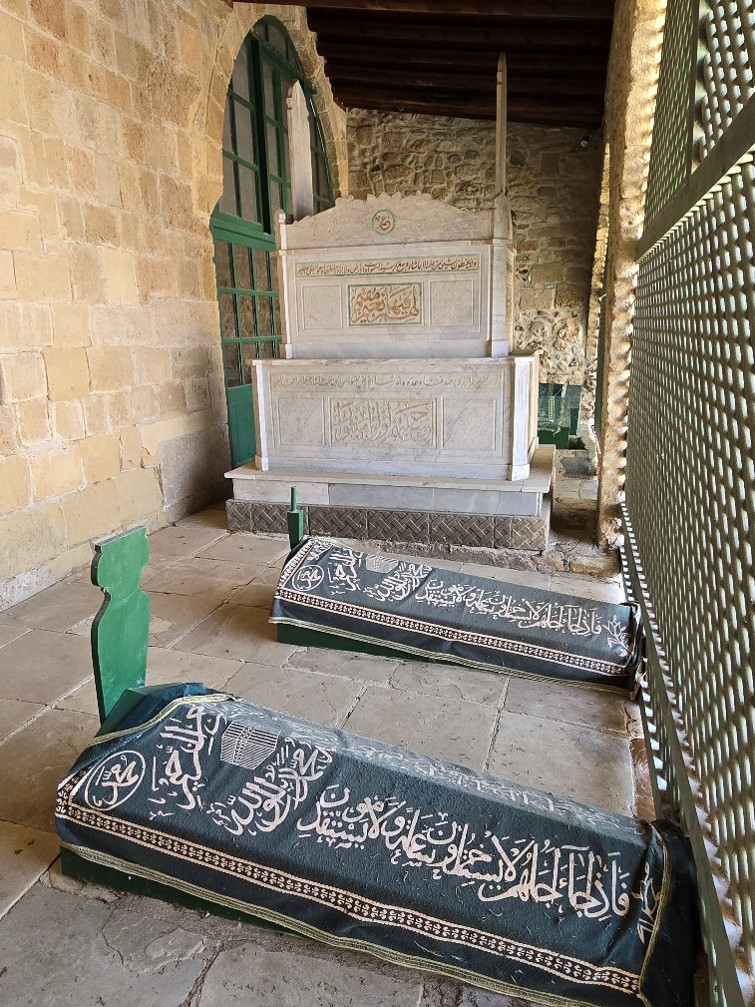 Umm Haram’s tomb is located behind the mosque wall of the qibla (in the direction of Mecca). A further inscription dated 1760 is found here. Aside from her, there are four other tombs, two of them former sheikhs. Another important tomb is a two-level marble sarcophagus, carrying the date 12 July 1929. The tomb belongs to Adile Hüseyin Ali, the Turkish wife of and a member of the Hashemite House, himself a grandson of the Ottoman grand vizier Koca Mustafa Reşid Pasha and a descendant of Muhammad. At the eastern corner of the mosque and the Tekke, a cemetery is located, which was closed to burials around 1899. Several past Turkish administrators are buried here.