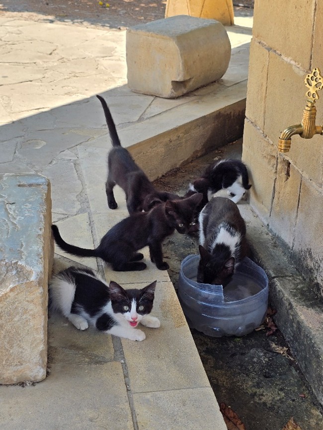 There is a courtyard with an ablution area, where cats will gather for water and food. Dozens of cats roam freely, and the people at the mosque ensure that they are well cared for.