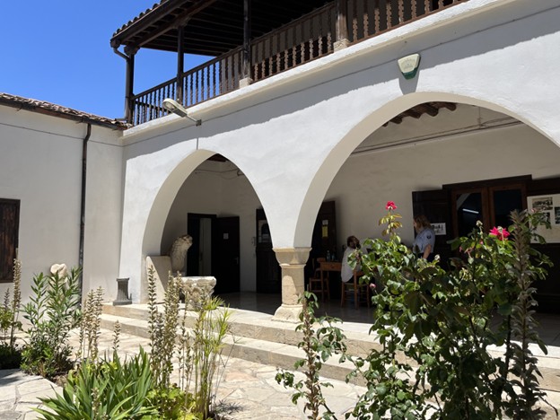 The museum is in a traditional Cyprus-style house, with a small courtyard in front. The building is a brilliant white, with swooping arch doorways that invite you to come in closer. You can tell that the building is old just by seeing the wear on the wooden shutters, doors, and stairs. Tall bushes of flowers surrounded the courtyard, almost enclosing it in this small space.