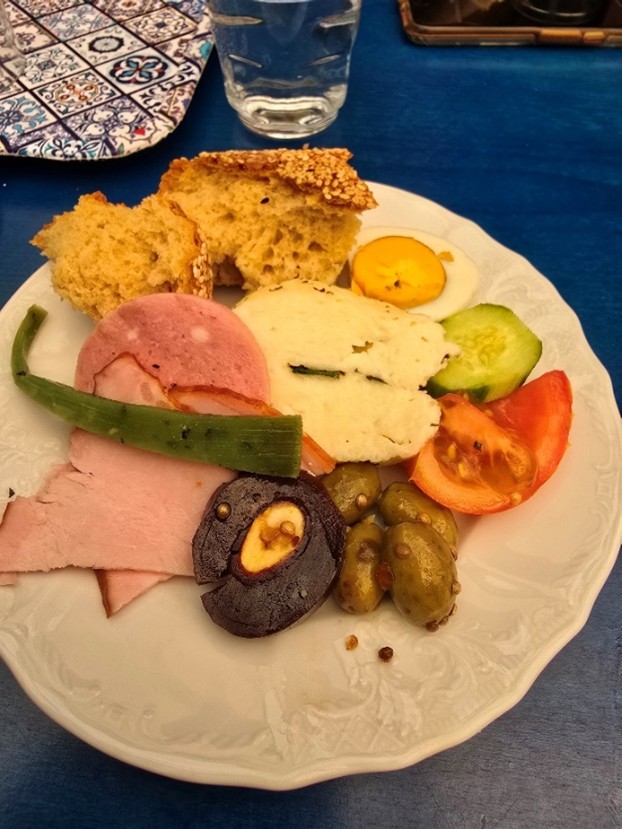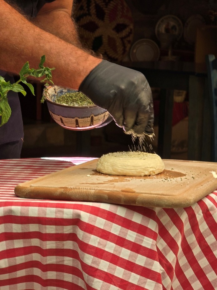 The process of making two different kinds of cheese was an interesting experience. He had explained to us how to make halloumi and another ricotta-like cheese, anari. Both used his goat’s milk to make, as well as a protein derived from vegetables. Others, he explained, used a product obtained from non-vegetarian sources. Still, he used this specific one so that his cheese could be enjoyed by those with dietary restrictions, religious or otherwise. While we were unable to see the entire process due to the time required, he did explain the steps of the days-long lengthy process. My favorite part was sampling these cheeses, accompanied by a spread of other foods, including salamis, vegetables, and bread. The halloumi, seasoned with salt and both dried and fresh mint, was amazing and obviously extremely fresh. It paired well with all the foods, tomatoes, cucumbers, and olives. My favorite item we were able to taste was the anari cheese. Served as a dessert with honey and cinnamon sprinkled on it, it tasted very similar to horchata or Mexican sweet rice, which I grew up eating. After the light brunch, we left and headed to Lefkara.