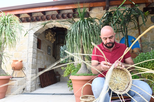 Petrous begins with an explanation of the long history of traditional basketry in Cyprus, handed down for generations, just as he acquired the skill from his grandparents. He displays the various reeds and straws used by skilled artisans to create these functional yet artistic pieces, describing the process of how they are softened and dyed. He notes that the museum contains two original baskets from his grandparents, which demonstrate the old way of adding color to baskets before the dying of reeds: they would weave thin strips of fabric from old clothing into the baskets. Traditional baskets had no color as they were more utilitarian. Common uses were for carrying vegetables from the field, such as potatoes and watermelons. He also showcases a small basket called a “talari,” which is used in the haloumi-making process.